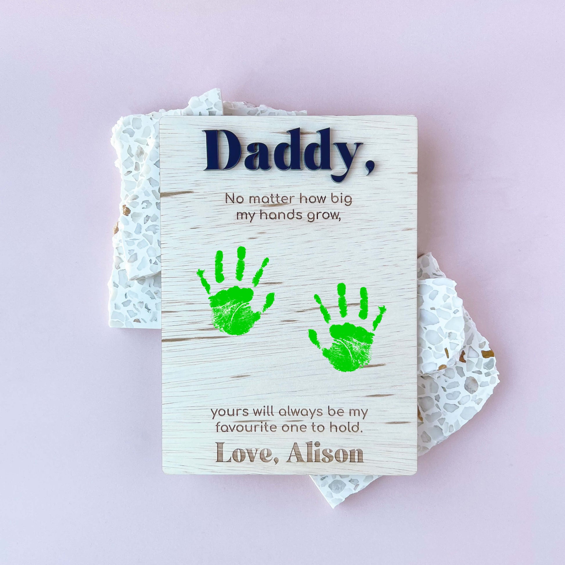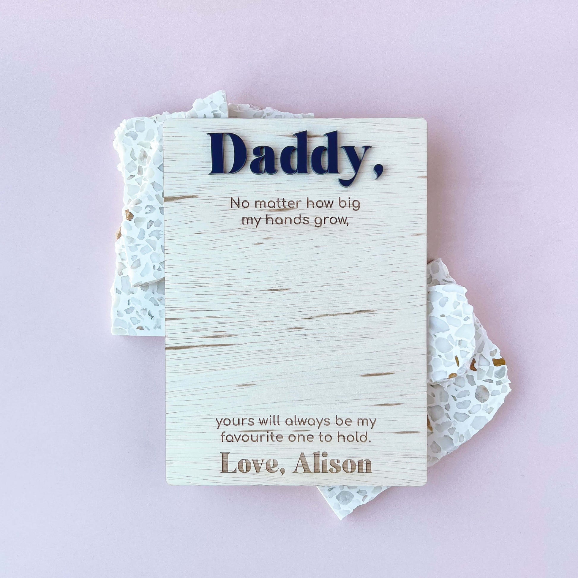 The plaque is A5 size, and you can change the heading to dad, daddy etc and choose the colour of acrylic.