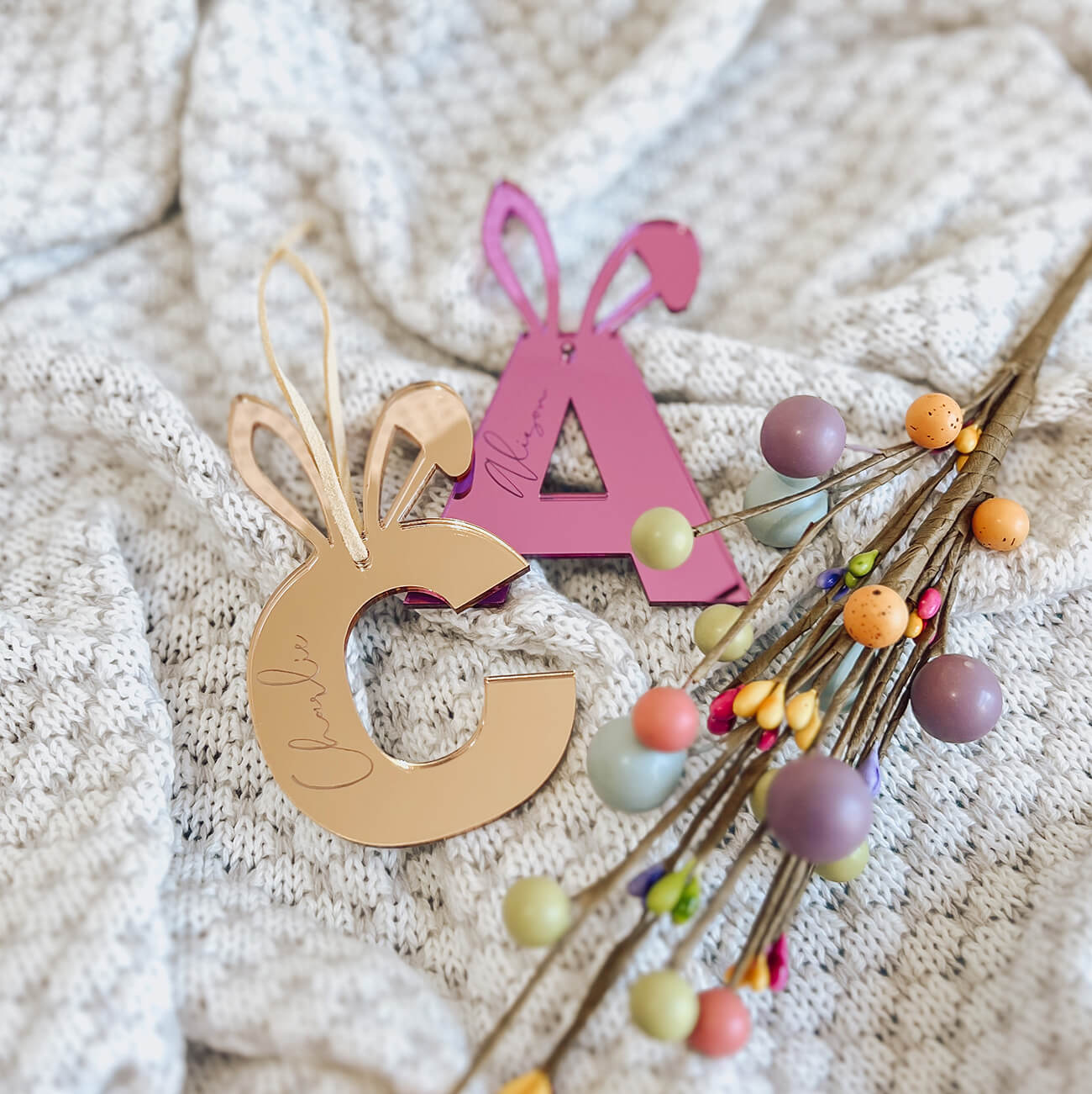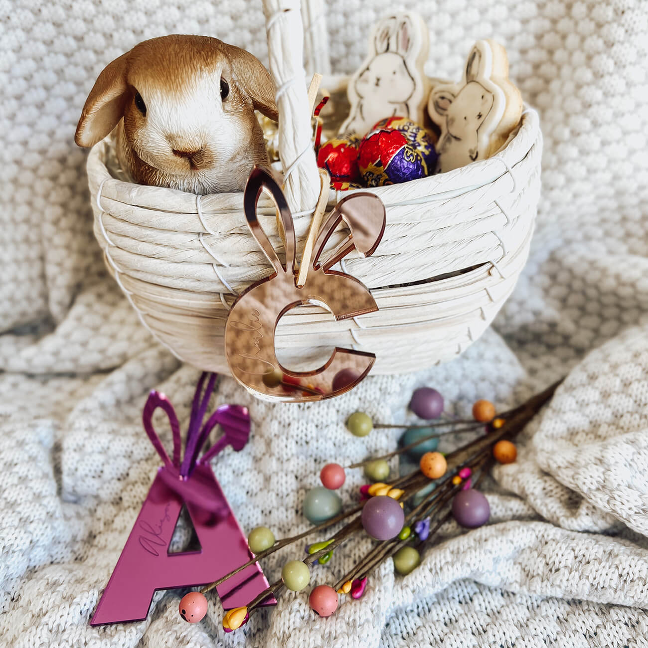 Our bunny ear alphabet tags are a super cute way to personalise your little ones Easter Basket, Crate or even just as a cute bag tag.