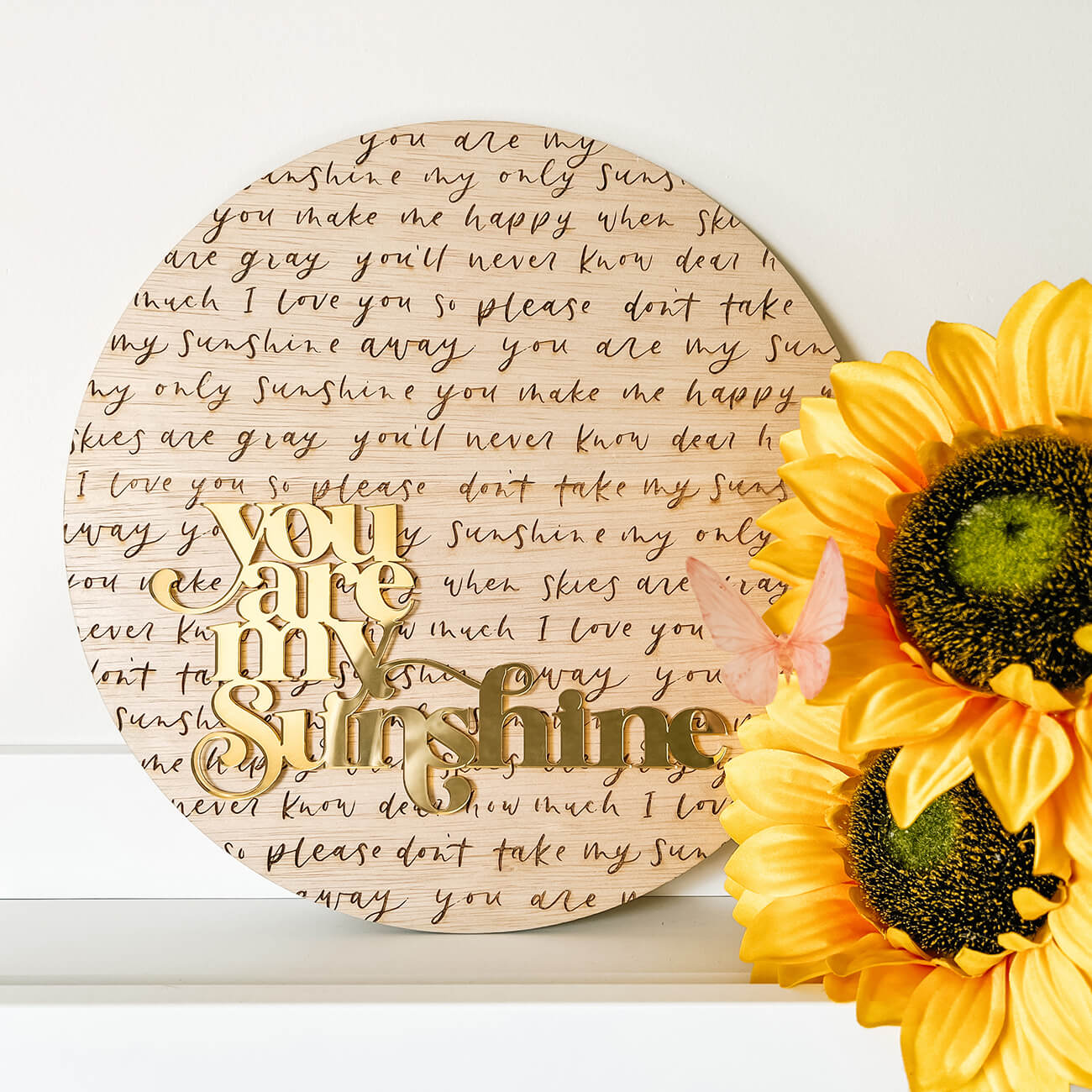 The background is engraved with the words from the song you are my sunshine with an acrylic accent, choice of colour available (mirror gold pictured)